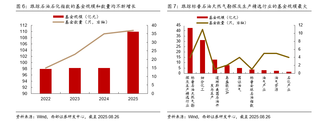 2022年末,石油石化类指数基金仅15只,规模为97.90亿元。截至2025.08.26,数量和规模分别增长至37只、109.92亿元,增速分别为147%、12%。