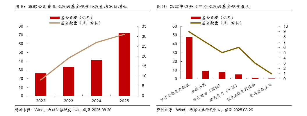 2022年末,公用事业类指数基金仅8只,规模为25.91亿元。截至2025.08.26,数量和规模分别增长至31只、72.44亿元,增速分别为288%、180%。