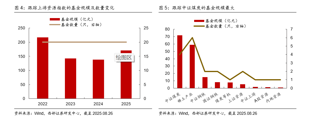 从2022年以来(截至2025.08.26,下同),上游资源指数基金数量始终在20只,规模先降后升,2022年末217.41亿元、2024年末138.69亿元、截至目前(2025.08.26,下同)171.16亿元。相较2022年末,目前规模下降21%。