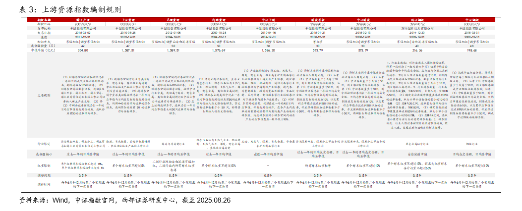 对比这9只指数的编制特点,1)选股范围均为A股。2)成分股数量普遍在50只及以内。3)样本的选取关注业务范围、日均总市值、日均成交额等。4)均设置了单个样本权重限制或其他权重限制。上证资源单个样本权重限制为5%,中证煤炭和中证钢铁单个样本权重限制为10%,稀土产业的单个权重样本、内地资源和国证钢铁的单个样本的权重限制均为15%,A股资源为二级行业内所有样本权重相等(二级行业间按自由流通市值加权),煤炭等权要求所有样本权重相等。此外,稀土产业的单个非权重样本不超5%(权重样本指过去一年在稀土开采、稀土加工、稀土贸易、稀土应用领域营业收入占比超过30%的上市公司)、国证钢铁要求前五大样本合计权重不超过60%。5)调样周期上,均为半年,实施时间为每年6月和12月的第二个星期五的下一交易日。