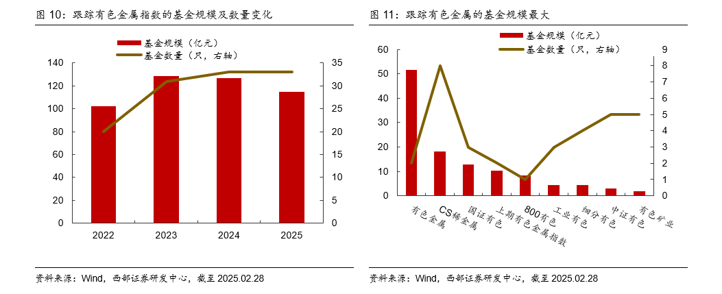 2022年末,有色金属类指数基金仅20只,规模为102.53亿元。截至2025.08.26,数量和规模分别增长至33只、114.66亿元,增速分别为65%、12%。