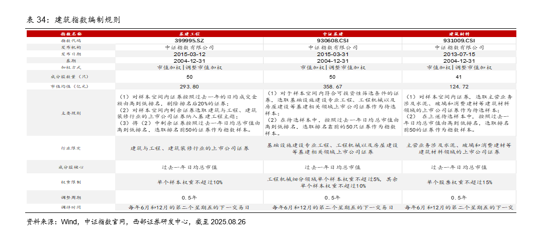 建筑类指数包括基建工程(399995.SZ)、中证基建(930906.CSI)、建筑材料(931009.CSI)。对比3只指数,1)选股范围为A股。2)成分股数量在50只以内。3)均设有样本权重限制,基础工程单样本不超10%;中证基建单样本不超15%;建筑材料中工程机械细分领域单样本不超5%,其余单样本不超10%。4)调样周期均为半年。