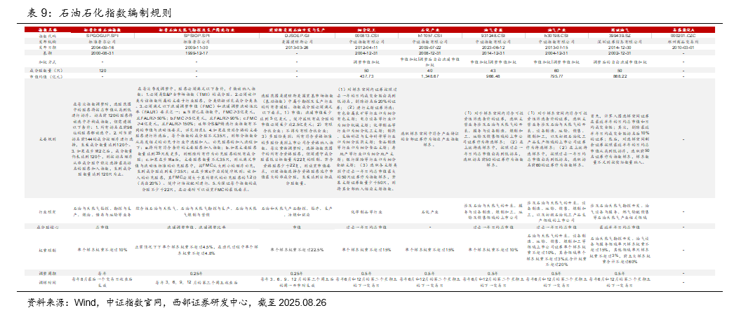 易盛能化A为期货指数,暂不考虑。对比其余8只指数的编制特点,1)选股范围上,标普全球石油指数为全球、标普石油天然气勘探及生产精选行业和道琼斯美国石油开发与生产为美股,其余均为A股。2)成份股数量普遍在60只及以内。3)样本的选取关注业务范围、日均总市值等。4)均设置了单个样本权重限制或者其他权重限制。标普石油天然气勘探及生产精选行业在正常情况下单个样本权重不超过4.5%,在迭代过程中单个样本权重不超过4.8%,标普全球石油指数和油气资源单个样本权重限制为10%,道琼斯美国石油开发与生产单个样本权重限制为22.5%,细分化工和石化产业单个样本权重限制为15%,油气产业、国证油气在特殊领域的单个样本权重限制分别为10%、15%;国证油气要求前五大样本合计不超过60%。5)调样周期上,标普全球石油指数为每年,标普石油天然气勘探及生产精选行业和道琼斯美国石油开发与生产为每季,其余均为每半年。