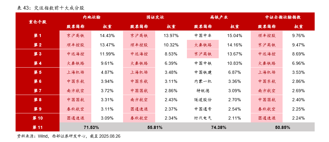 从前十大成分股来看,内地运输、国证交运、中证全指运输指数完全重合,包括京沪高铁、顺丰控股、中远海控、大秦铁路、上海机场、中国东航、南方航空、中国国航、春秋航空和圆通速递。