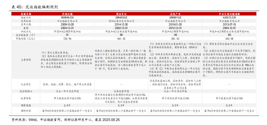 对比这4只指数的编制特点,1)选股范围均为A股。2)成分股数量上,内地运输、国证交运、高铁产业、中证全指运输指数分别为31只、60只、45只、90只。3)样本的选取关注业务范围、日均总市值、自由流通市值等。4)内地运输、国证交运和中证全指运输精选的单样本权重均不超15%;高铁产业指数中单样本在每次定期调整时的权重不超15%,前五大样本权重合计不超60%。5)调样周期均为半年。