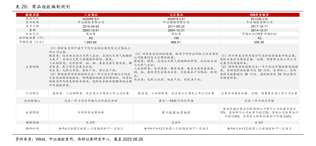 对比这3只指数的编制特点,1)选股范围方面,上证商品为沪市、其余2只指数为A股。2)成分股数量上,上证商品、大宗商品、SSH黄金股票分别为50只、100只、42只。3)样本的选取关注业务范围、日均总市值、日均成交金额等。4)均设置了单个样本权重限制或者其他权重限制,上证商品与大宗商品采取等权重分配;SSH黄金股票对黄金业务公司设权重不超过15%,其余不超过3%,且前五大权重合计不超过60%。5)调样周期均为半年。