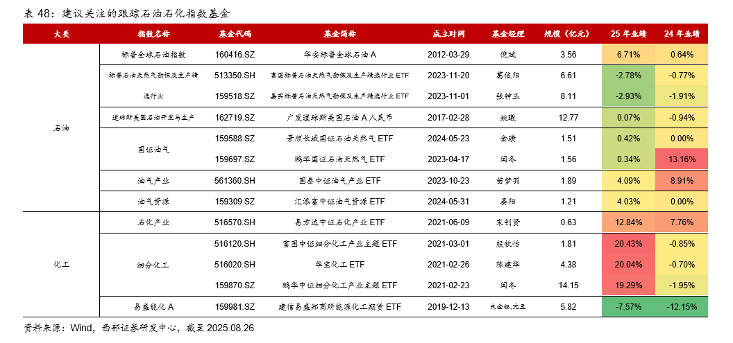 跟踪标普全球石油指数、道琼斯美国石油开发与生产的基金均为1只,管理人分别为华安、广发;跟踪标普石油天然气勘探及生产精选行业的基金均成立于2011年9月之后,包括博时、富国、华宝、嘉实4家管理人;跟踪国证油气的基金均成立于2023年4月之后,包括景顺长城、鹏华2家管理人;跟踪石化产业的基金均成立于2021年6月之后,包括华夏、易方达2家管理人;跟踪细分化工的基金均成立于2021年2月之后,包括富国、国泰、华宝等8家管理人;跟踪易盛能化A的仅建信1家管理人;跟踪油气产业的基金均成立于2023年10月之后,包括国泰、华泰柏瑞、天弘3家管理人;跟踪油气资源的基金均成立于2024年4月之后,包括博时、汇添富、银华3家管理人。