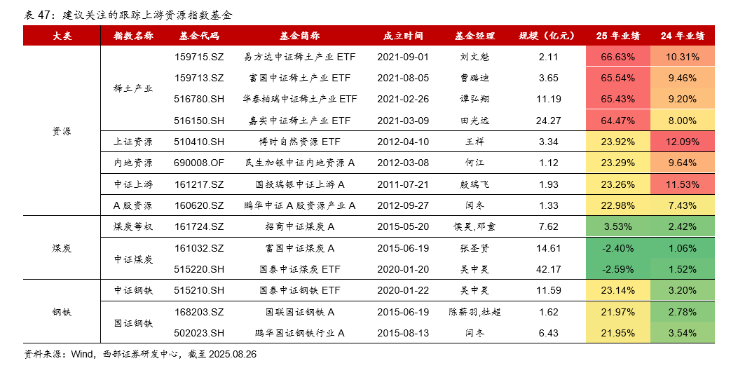 跟踪稀土产业的基金均成立于2021年2月之后,包富国、华泰柏瑞、嘉实、易方达4家管理人;跟踪上证资源的基金均成立于2012年4月之后,仅博时1家管理人;跟踪国证钢铁的基金均成立于2015年6月之后,包括国联、鹏华2家管理人;跟踪中证钢铁的基金均成立于2020年1月之后,仅国泰1家管理人;跟踪中证煤炭的基金均成立于2015年6月后,包括富国、国联、国泰3家管理人;跟踪内地资源、中证上游、A股资源、煤炭等权的基金均为1只,管理人分别为民生加银、国投瑞银、鹏华、招商。