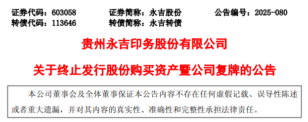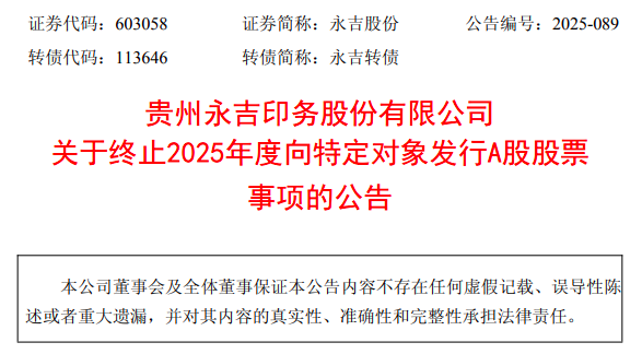 贵州烟标龙头永吉股份10月9日晚间公告,公司当日召开董事会和监事会会议,审议通过了相关议案,同意公司终止2025年度向特定对象发行A股股票事项。根据公司今年3月份披露的定增预案,本次定增募集资金总额约为4.9亿元。