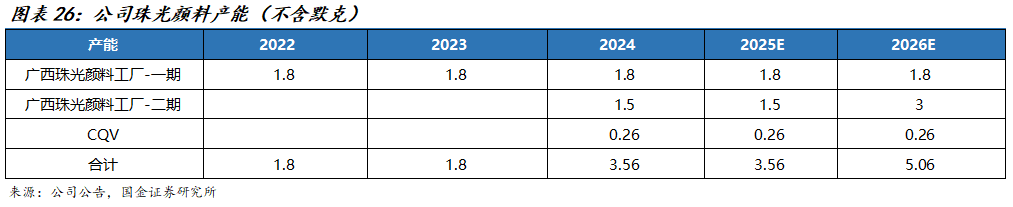 广西珠光颜料工厂二期,珠光颜料产能3万吨,截止2024年底投产1.5万吨产能、其中实际贡献产量约6000吨,2025年估计产量可以发挥至接近1.2万吨,后续产能扩至3万吨;