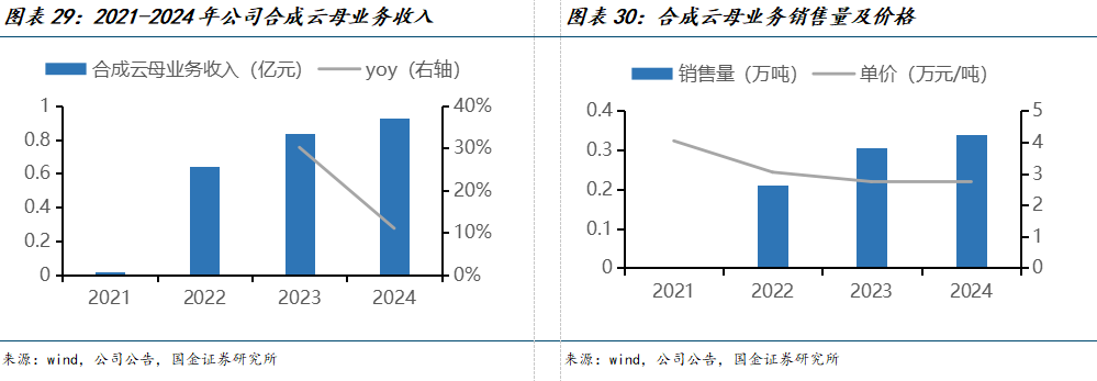 公司合成云母业务收入在2020年及以前不到千万元级别,2022年起逐步放量,2022-2024年合成云母收入分别为0.64、0.84、0.93亿元,销量分别为0.21、0.31、0.34万吨,2023-2024年单价稳定在2.7-2.8万元/吨。
