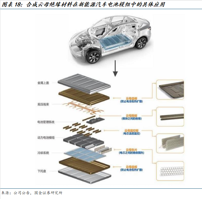 合成云母基珠光颜料可应用于新能源汽车电池高温防护+低温防护+全包围包装:①高温防护,当电池热量堆积超过绝缘材料的临界温度值时、容易导致热失控,导致起火爆炸等安全事故,合成云母阻燃防护板可有效防止热量传递蔓延。 ②低温防护,低温环境中锂电子活性降低、出现失电情况,导致动力电池功率、容量降低,影响续航能力,合成云母绝缘阻燃件导热系数低,隔热保温性能极佳,可在电池低温时发挥保温作用。③合成云母制品可应用于云母电池盖板、云母电池监控板、云母电池组隔板、云母电池单体隔板等动力电池组组覆盖面,起到防止电池包热扩散、电芯温度监控报警、电池组绝缘隔热等作用。