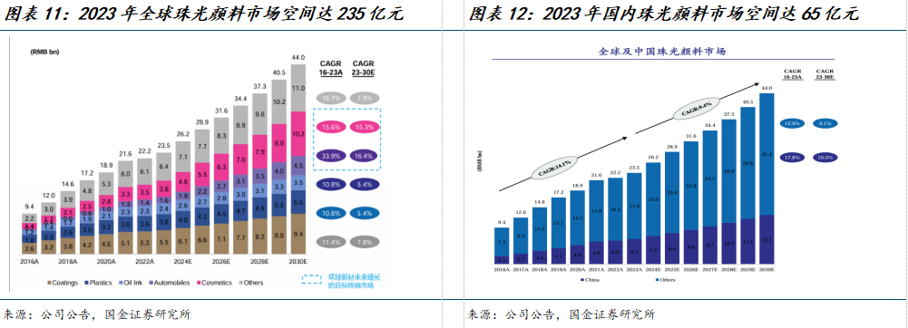 根据公司公告,全球珠光颜料市场空间从2016年的94亿元增长至2023年的235亿元、CAGR达14.0%,预计2030年达到440亿元,2023-2030年行业空间CAGR达9.4%。国内2023年市场空间65亿元、2024年预计达72亿元,公司2024年国内收入13.32亿元、市占率为18.5%,坤彩科技珠光颜料收入8.78亿元、市占率12.2%,双龙头国内市占率合计超30%。珠光颜料行业具备跨行业渗透、穿越经济周期的增长能力,高端消费级化妆品+汽车领域将成为未来行业增长的主要动能,全球化妆品珠光颜料市场有望从2023年的38亿元增长至2030年的102亿元,汽车珠光颜料市场有望从2023年的16亿元增长至2030年的45亿元。
