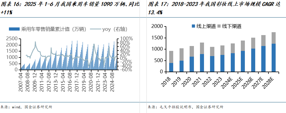 彩妆+汽车均为新消费领域高景气赛道(彩妆+汽车行业均为双位数增速),同时叠加国产替代趋势,国产化妆品/汽车厂商更有动力优先采购国内供应链。