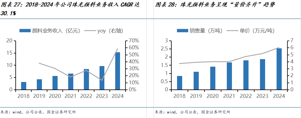 产能投放+产品结构优化,推动量价齐升。公司颜料业务收入从2018年的3.15亿元增长至2024年的15.28亿元,CAGR达30.1%,剔除CQV收购,2024年广西七色本部颜料业务收入达12.32亿元,CAGR同样高达25.5%。国内头部玩家享受红利,珠光颜料业务呈现“量价齐升”趋势: