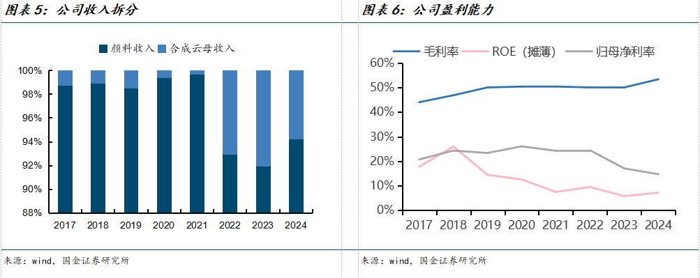 收入拆分:公司主要业务包括颜料+合成云母,其中2024年颜料业务收入15.28亿元,收入占比达93%,合成云母是珠光颜料上游,2024年合成云母收入0.93亿元,占比达6%。