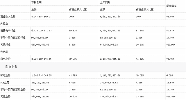 从业务板块来看,消费电子业务作为营收主力,上半年实现收入47.13亿元,同比微降0.87%。其中彩电业务收入同比增长6.09%,但毛利率仅有0.39%;白电业务收入同比下滑6.76%,整个消费电子业务毛利率仅3.23%。康佳在财报中指出,行业竞争加剧、新品上市进度慢等问题是影响消费电子业务承压的因素。
