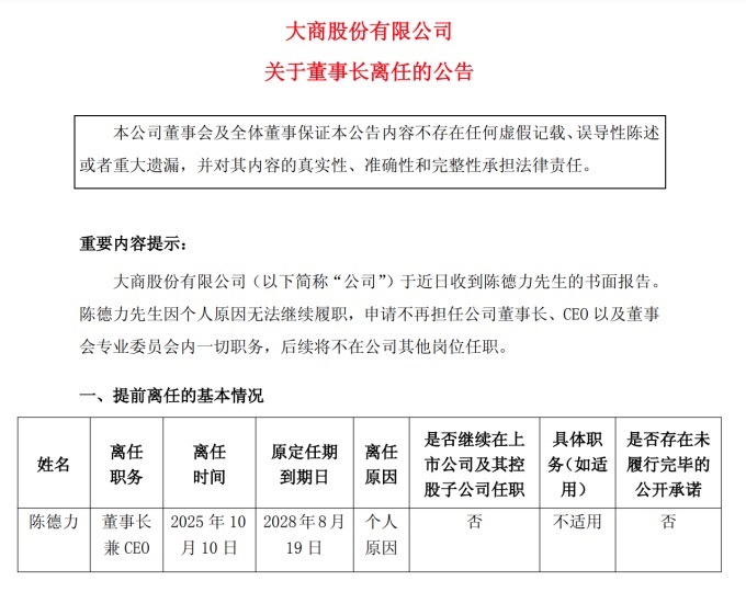 大商方面表示,“公司于近日收到陈德力的书面报告,其因个人原因无法继续履职,申请不再担任公司董事长、CEO以及董事会专业委员会内一切职务,后续将不在公司其他岗位任职。”