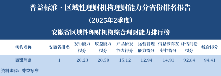 根据普益标准的评价结果,徽银理财位居安徽省区域性理财机构综合理财能力第一名。各单项排名结果显示,徽银理财的发行能力得分、收益能力得分、产品研发能力得分、运营管理能力得分和信息披露友好性得分均位居该省第一名。
