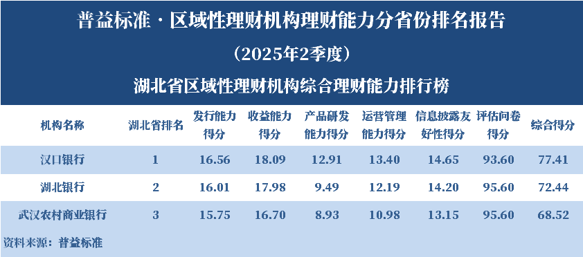 根据普益标准的评价结果,汉口银行位居湖北省区域性理财机构综合理财能力第一名。各单项排名结果显示,汉口银行的发行能力得分、收益能力得分、产品研发能力得分、运营管理能力得分和信息披露友好性得分均位居该省第一名。