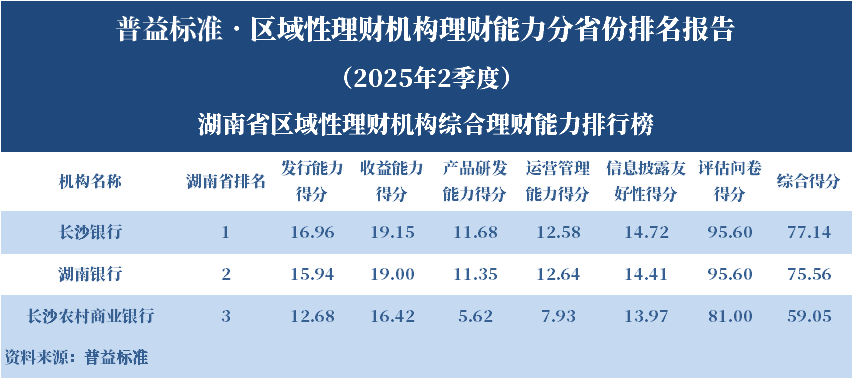 根据普益标准的评价结果,长沙银行位居湖南省区域性理财机构综合理财能力第一名。各单项排名结果显示,长沙银行的发行能力得分、收益能力得分、产品研发能力得分和信息披露友好性得分均位居该省第一名;湖南银行的运营管理能力位居该省第一名。