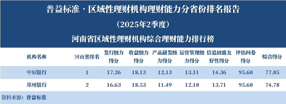 根据普益标准的评价结果,中原银行位居河南省区域性理财机构综合理财能力第一名。各单项排名结果显示,中原银行的发行能力得分、产品研发能力得分、运营管理能力得分和信息披露友好性得分均位居该省第一名;郑州银行的收益能力得分位居该省第一名。