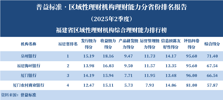根据普益标准的评价结果,泉州银行位居福建省区域性理财机构综合理财能力第一名。各单项排名结果显示,泉州银行的发行能力得分、收益能力得分、信息披露友好性得分均位居该省第一名;福建海峡银行的产品研发能力得分位居该省第一名;厦门银行的运营管理能力得分位居该省第一名。