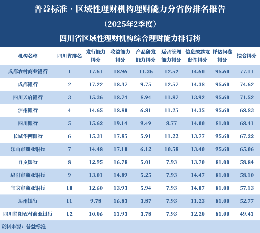 根据普益标准的评价结果,成都农村商业银行位居四川省区域性理财机构综合理财能力第一名。各单项排名结果显示,成都农村商业银行的发行能力得分、产品研发能力得分和信息披露友好性得分均位居该省第一名;成都银行的运营管理能力得分位居该省第一名;四川银行的收益能力得分位居该省第一名。