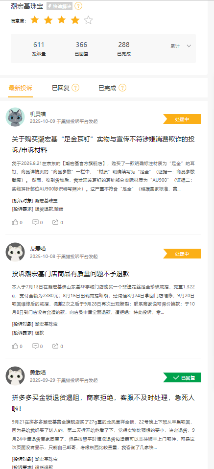 浏览黑猫投诉,截至2025年10月10日,“潮宏基珠宝”相关投诉累计611条,涉及产生划痕、掉色、不牢变形等质疑。