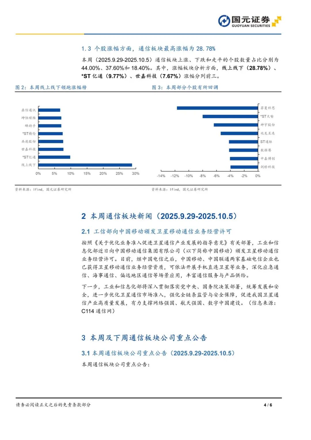 个股方面:本周(2025.9.29-2025.10.5)通信板块涨幅板块分析方面,涨幅板块分析方面,线上线下(28.78%)、*ST亿通(9.77%)、世嘉科技(7.67%)涨幅分列前三。