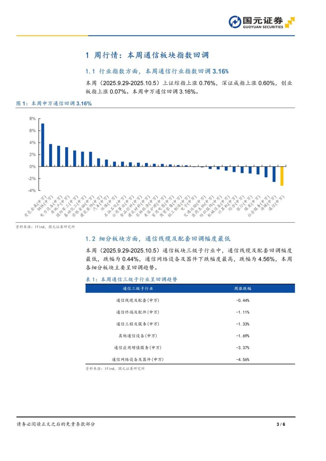 细分行业:本周(2025.9.29-2025.10.5)通信板块三级子行业中,通信线缆及配套回调幅度最低,跌幅为0.44%,通信网络设备及器件下跌幅度最高,跌幅为4.56%,本周各细分板块主要呈回调趋势。