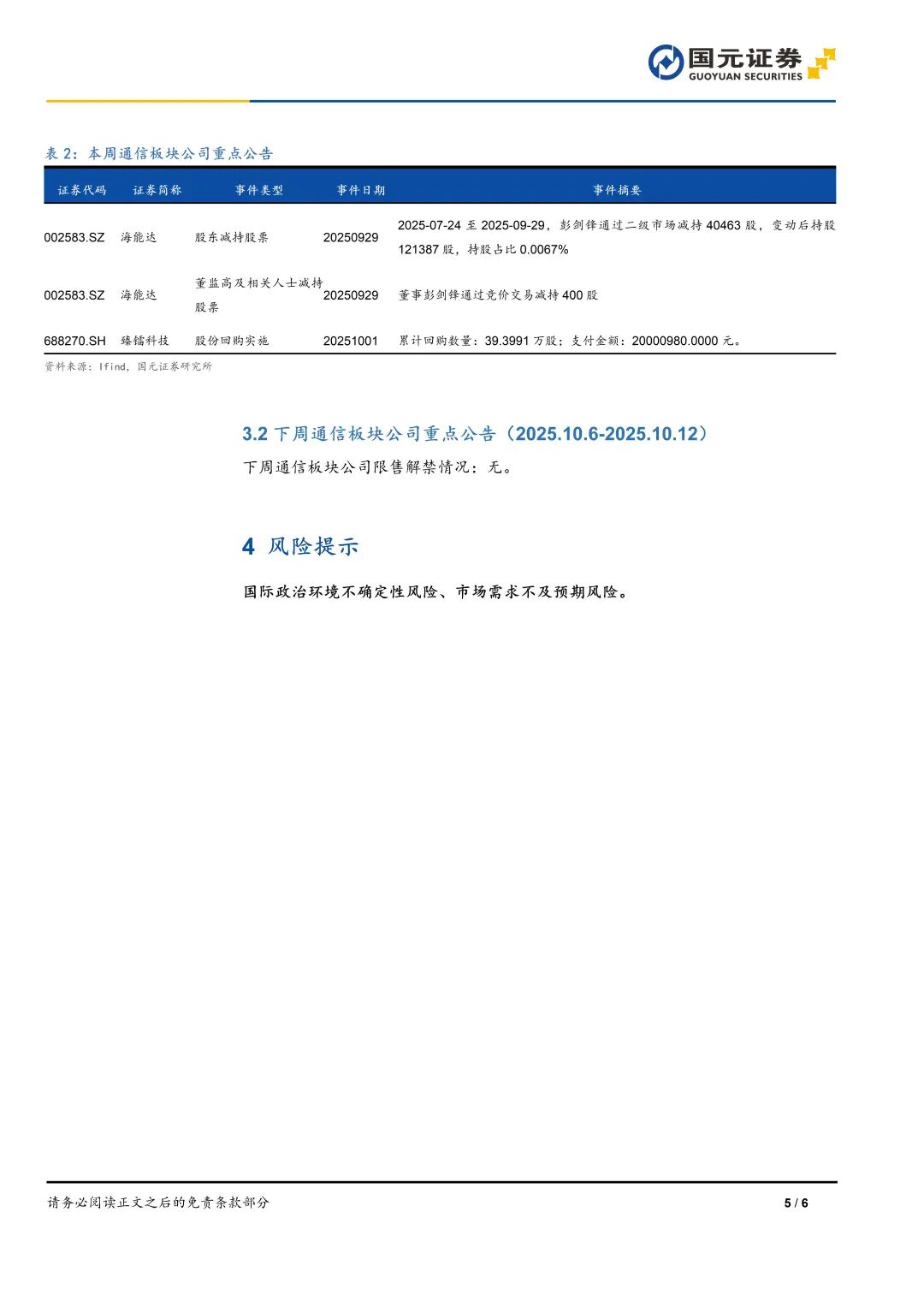 周行情:本周(2025.9.29-2025.10.5)上证综指上涨0.76%,深证成指上涨0.60%,创业板指上涨0.07%。本周申万通信回调3.16%。考虑通信行业的高景气度延续,AI、5.5G及卫星通信持续推动行业发展,我们给予通信行业“推荐”评级。