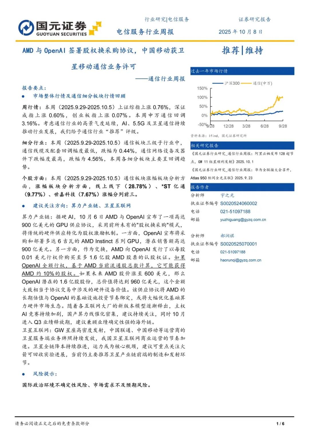 本报告摘自国元证券2025年10月8日已发布的《AMD与OpenAI签署股权换采购协议,中国移动获卫星移动通信业务许可——通信行业周报》,具体报告及分析内容请详见报告。若因对报告的摘编等产生歧义,应以报告发布当日的完整内容为准。