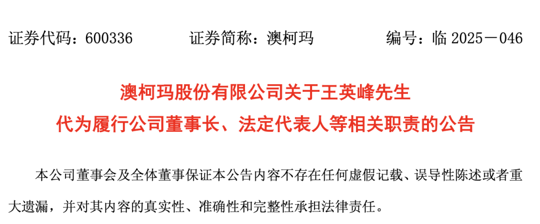 公告显示,2025 年 10 月 9 日,张斌向澳柯玛董事会递交《告知函》,明确因健康治疗需求,申请暂离董事长、法定代表人及董事会战略委员会主任委员等岗位,并提请董事会依据《中华人民共和国公司法》《公司章程》等规定,推举合适董事代为履职,以保障公司经营不受影响。会议决定,自即日起,由公司现任董事、总经理王英峰代为履行董事长、法定代表人以及董事会战略委员会主任委员等职责,履职期限将持续至张斌恢复履行相关职责之日止。