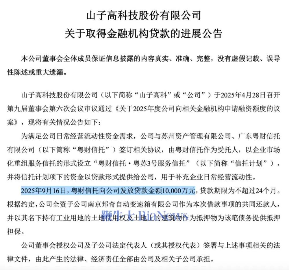 回复官方虽然较为模糊,但在今年9月,广东粤财信托有限公司曾向山子高科发放贷款高达一个亿,山子高科全资子公司南京邦奇自动变速箱有限公司为共同还款人,并以其名下工业用地的土地使用权及地上建筑物提供抵押担保。