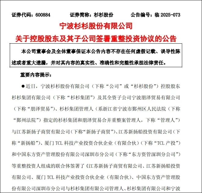 2025年2月,杉杉集团被裁定进入实质合并重整,郑氏家族对“杉杉系”的控制画上句号。