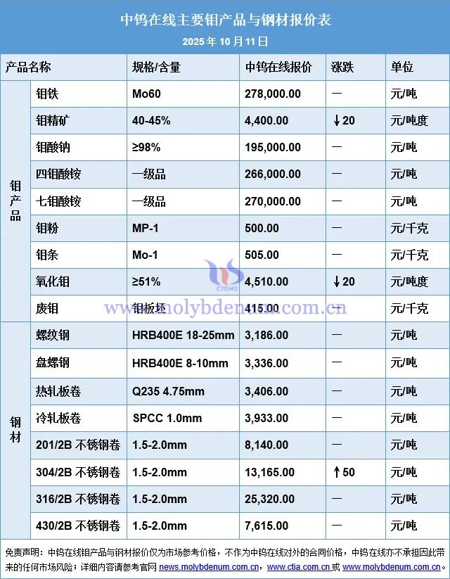 从需求端上看,国庆假期归来后的第一周,下游用户尚未完全启动采购计划,再加上钼下游生产企业普遍面临资金偏紧的问题,市场需求更是难以释放。近日,进场招标钼铁的钢材企业有二重装备,江苏中天,一重常州新材料,中原特钢,河北普阳钢铁,太原重工等。
