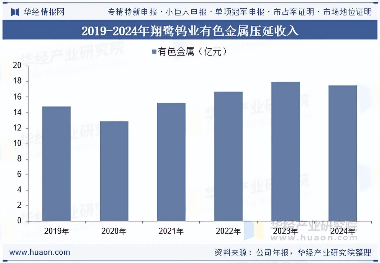 翔鹭钨业通过多年的发展,形成了从APT到硬质合金的产品体系。公司的主要产品为氧化钨(包括黄色氧化钨、蓝色氧化钨、紫色氧化钨等)、钨粉,碳化钨粉、钨合金粉及钨硬质合金等深加工产品。根据公司年报显示,2024年公司有色金属压延收入为17.49亿元。