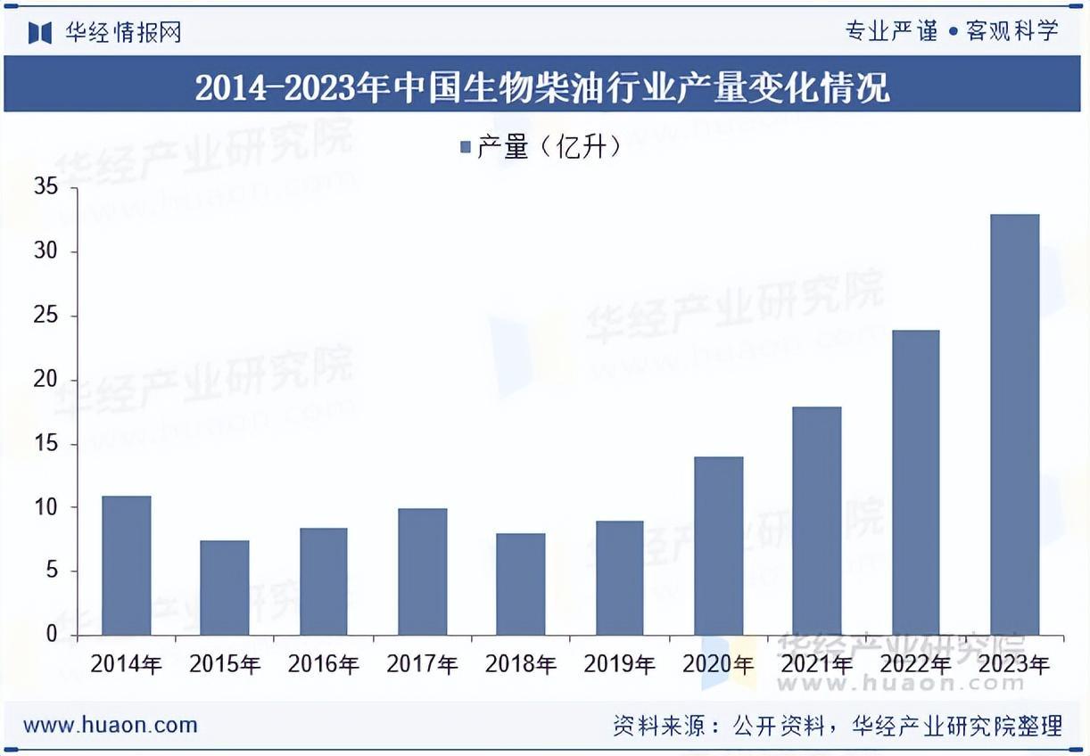 随着全球对可再生能源的需求增加以及环境保护意识的增强,生物柴油作为一种绿色、可再生的替代燃料备受关注。我国生物柴油生产主要以餐厨废弃油脂为主的“地沟油”和油脂工业的油脚为原料,这些原料来源广泛且稳定。近十年中国生物柴油总产量总体上呈现出迅速增长态势,2023年国内生物柴油产量达到33万吨左右,2014-2023年期间复合年增长率达到13%。