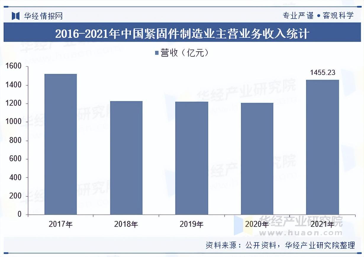 数据显示,2021年我国紧固件制造业主营业务收入为1455.23亿元,同比增长20.07%。整体来看,紧固件行业市场规模较大,但是生产企业数量众多,竞争比较激烈。2021年,我国紧固件生产企业约有1457家,平均每家企业的主营业务收入也仅为1亿元。