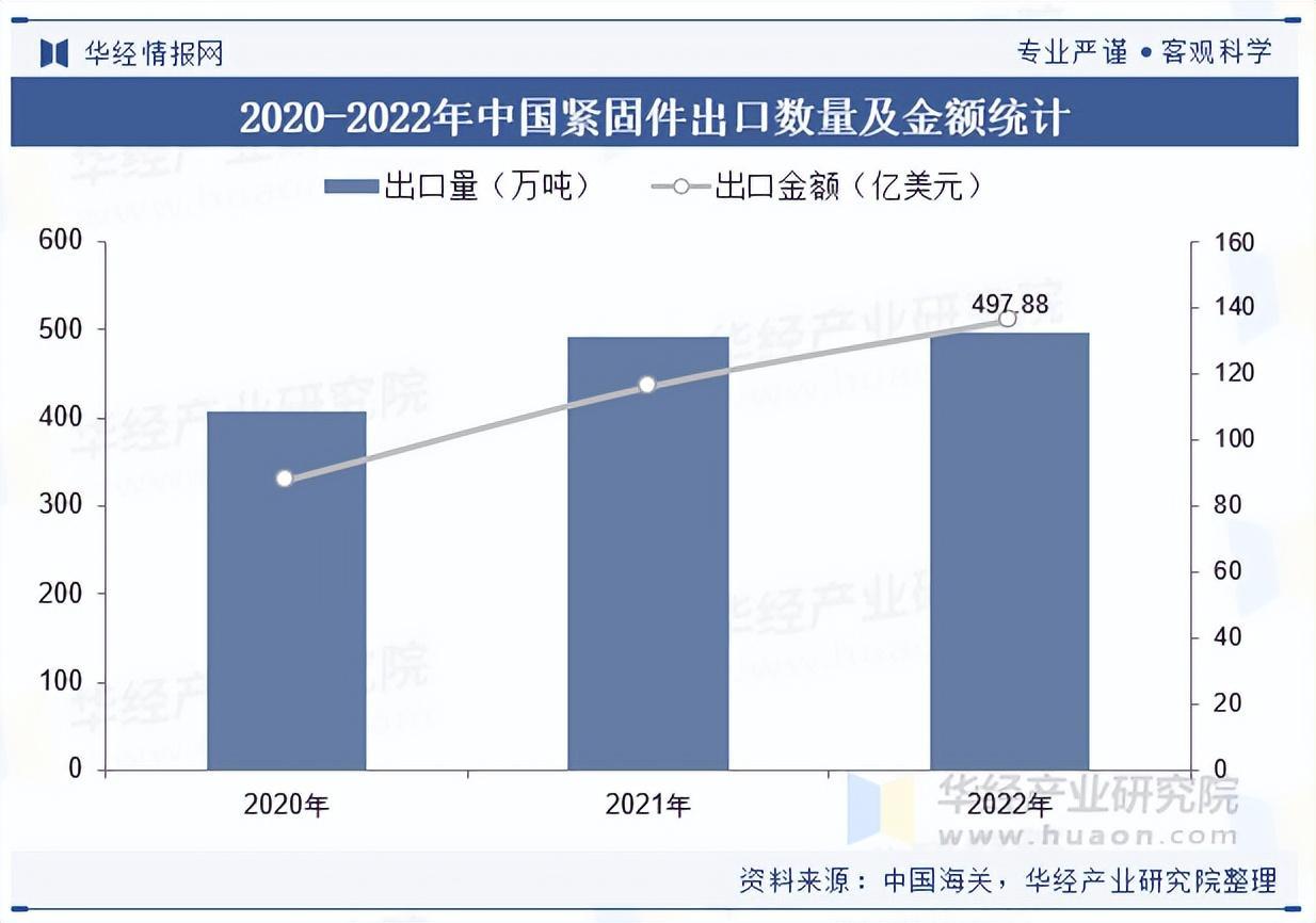 尽管我国紧固件产业整体起步较晚,但近年来发展较为迅速,整体在产业内企业带动下成为贸易顺差的优势产业。据统计,2022年我国紧固件出口达到497.9万吨,同比增长1.4%;出口额则达到136.5亿美元,同比增长17.8%,单价、出口量同升。