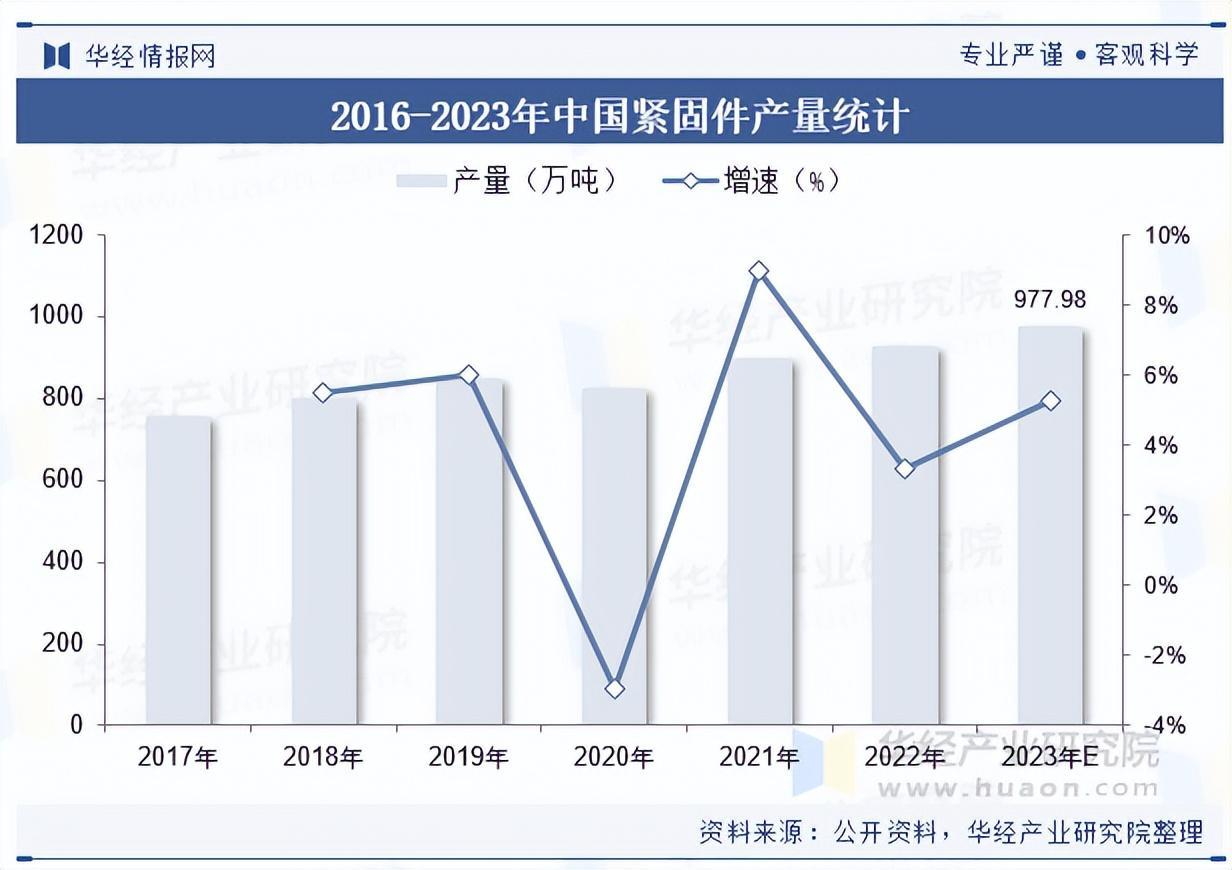 紧固件是国民经济各部门应用范围最广、使用数量最多的机械基础件之一,我国是全球的紧固件制造大国。据数据,2022年我国紧固件产量达到约929万吨,据预测,2023年我国紧固件产量将达到977.98万吨。