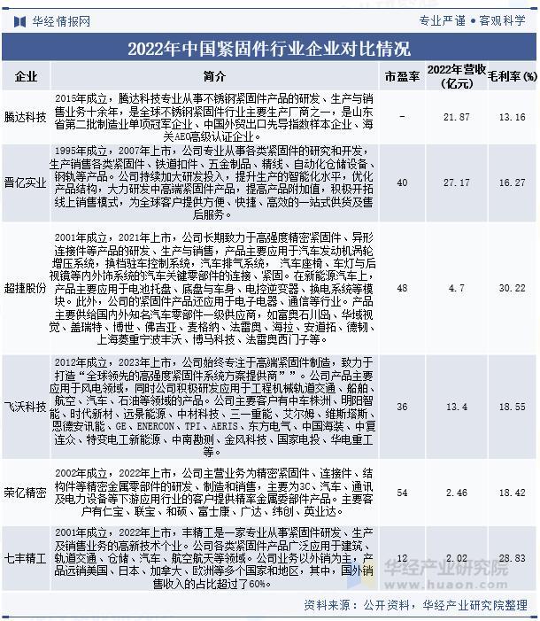 目前紧固件行业可比公司主要有腾达科技、晋亿实业、超捷股份、飞沃科技和荣亿精密等。其中飞沃科技专注于高强度紧固件和系统,从风电行业向石油、航空航天等领域持续扩展;2020年飞沃科技营收规模达到10亿,获得工信部制造业单项冠军称号;2021年开拓航空航天和石油领域产品;2022年以来,飞沃科技在湖南常德、湖北黄石、吉林大安、越南等地建厂,助力有效产能扩充。
