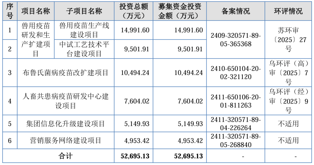 招股书显示,天康制药本次IPO拟募集资金5.27亿元,其中兽用疫苗研发和生产扩建项目募资1.28亿元,布鲁氏菌病疫苗改扩建项目募资1.05亿元,人畜共患病疫苗研发中心建设项目募资7604.02万元,集团信息化升级建设项目募资5149.93万元,营销服务网络建设项目募资4953.42万元。