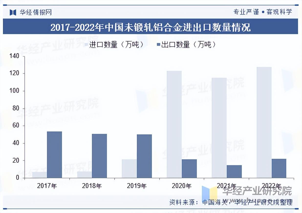 近年来,因制造业需求有所改善,我国未锻轧铝合金活进出口市场活跃度提升,又因国内库存偏低,促使买家加快进口步伐,市场逐渐被进口贸易占据主导。2022年,中国未锻轧铝合金进、出口数量分别为127.8万吨和22.5万吨。