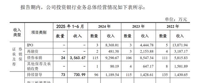 细分看,截至2025年6月末,东莞证券投行团队有172名员工,较2024年同期减少了40人。172名投行员工在2025年上半年没有完成一个IPO项目,再融资项目也为0,没有取得相关收入,主要的收入来自债券承销。