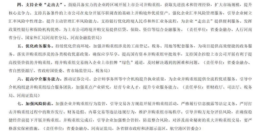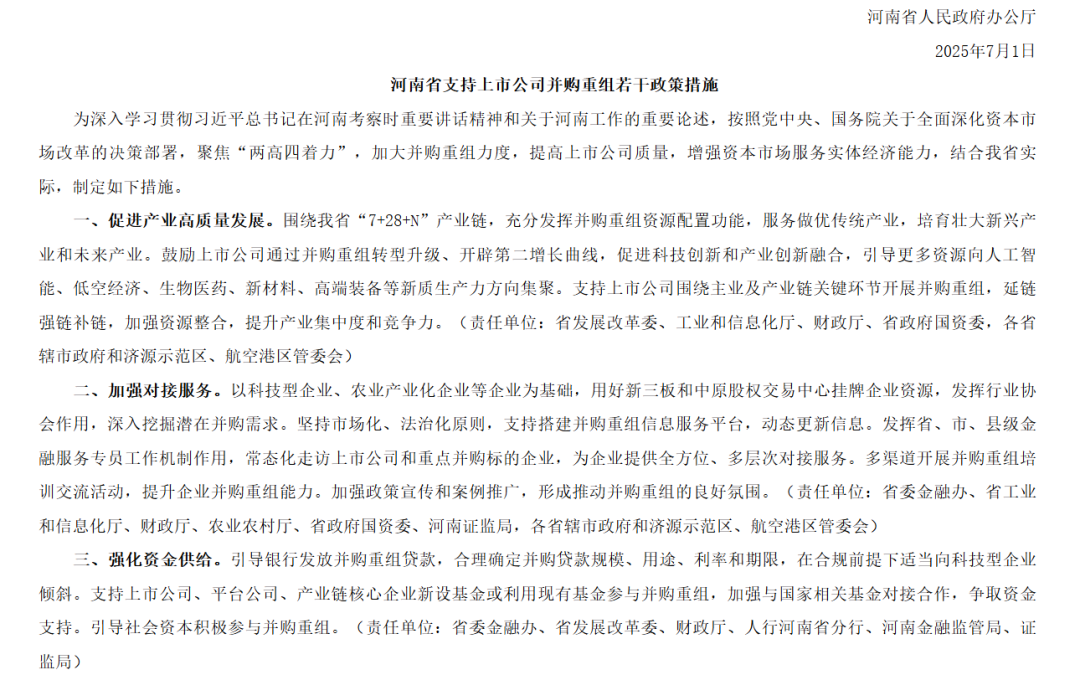 值得一提的是,2010年,河南省人民政府发布关于积极促进企业战略重组的指导意见,15年后,也就是2025年7月1日,河南省人民政府办公厅发布关于印发河南省支持上市公司并购重组若干政策措施的通知。