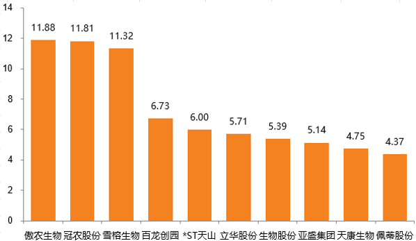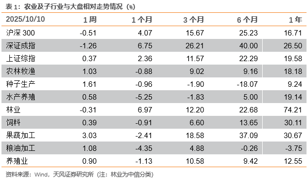 最最新交易周(2025年10月9日-2025年10月10日),农林牧渔行业+1.03%,同期上证综指、深证成指、沪深300变动分别为+0.37%、-1.26%、-0.51%。个股中涨幅靠前的分别为:傲农生物(维权)+11.88%、冠农股份(维权)+11.81%、雪榕生物+11.32%、百龙创园+6.73%、*ST天山+6.00%、立华股份+5.71%、生物股份+5.39%、亚盛集团+5.14%、天康生物+4.75%、佩蒂股份+4.37%。