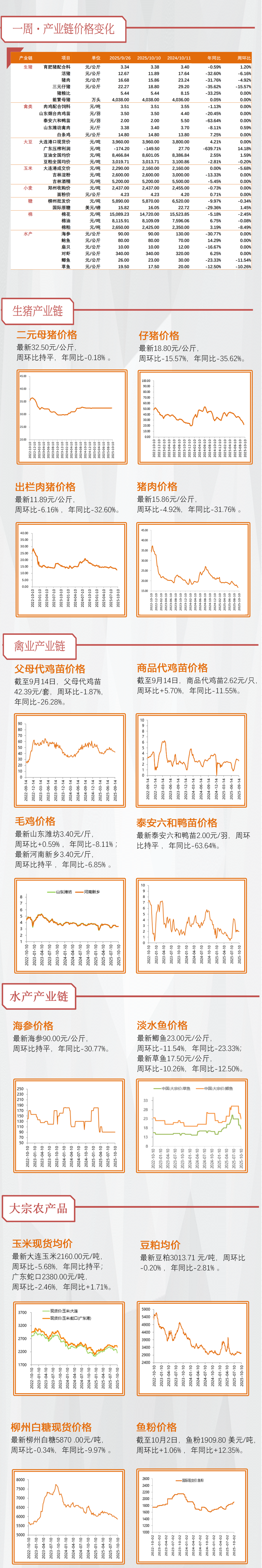 1)国庆猪价超预期下跌&外销仔猪亏损加大。截至10月11日,全国生猪均价11.41元/kg,较10月1日大幅下跌9.37%(智农通),本周行业自繁自养亏损为77.09元/头;截止10月10日,7kg断奶仔猪价格为183元/头,本周外销仔猪头均亏损约83元/头。供应端,本周出栏均重为128.48kg(环比-0.07kg),仍处于历史同期相对高位,10月涌益/钢联/卓创样本企业计划出栏量环比+5.14%/+5.48%/+7.32%。需求端,天气转凉,利好消费维持中位稳定运行,9月日度样本日均宰量环比增幅8.62%。