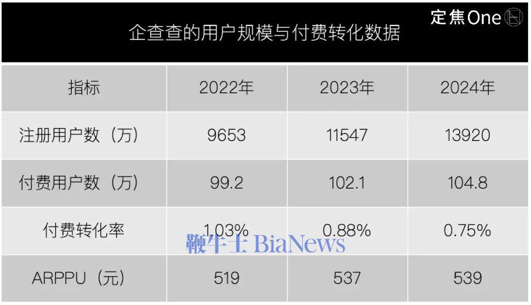2022年9月,企查查把1年VIP从360元提到了388元,涨幅不到8%。但提价后的2023年,ARPPU(付费用户平均收入)只增长了3.4%;到了2024年,ARPPU增幅更是只有0.3%。